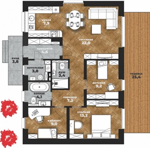 В прихожей запроектирована ниша под вместительный шкаф-купе и вход в техническое помещение, которое можно использовать как котельную, кладовую или прачечную.