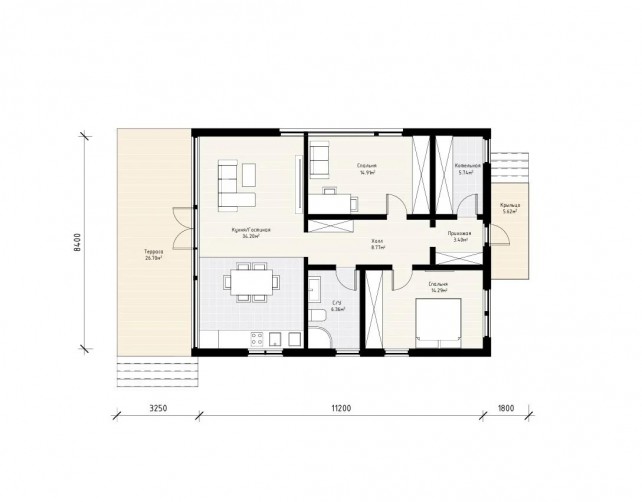 В доме просторная кухня-гостиная, две спальни, прихожая, бойлерная и отдельный санузел.