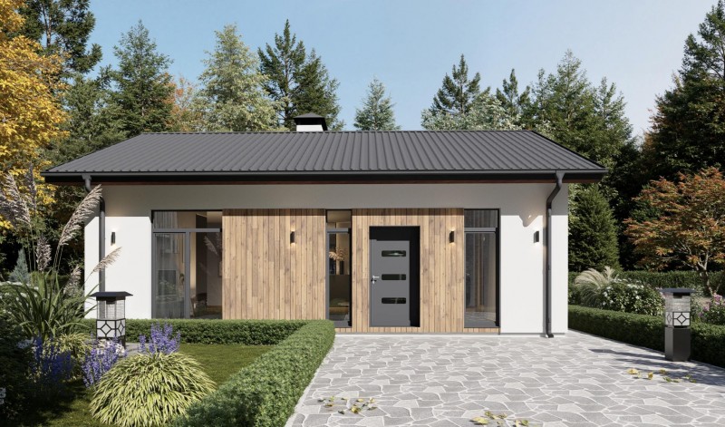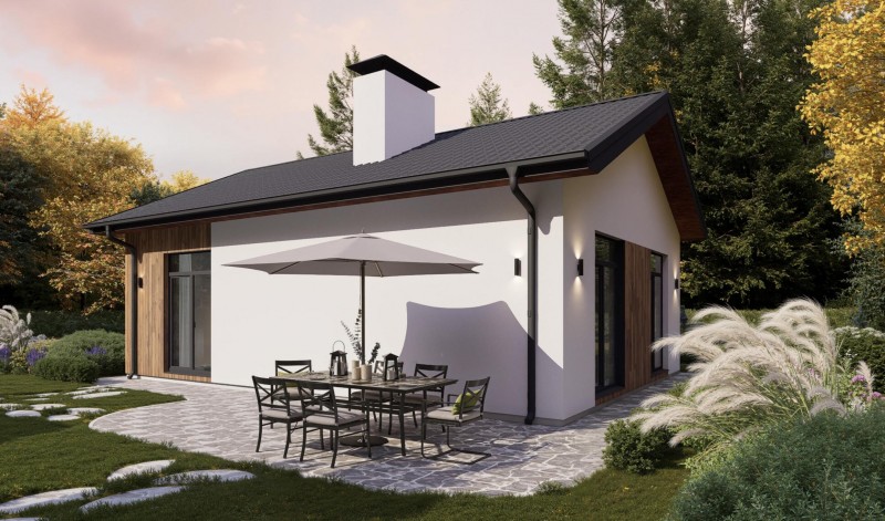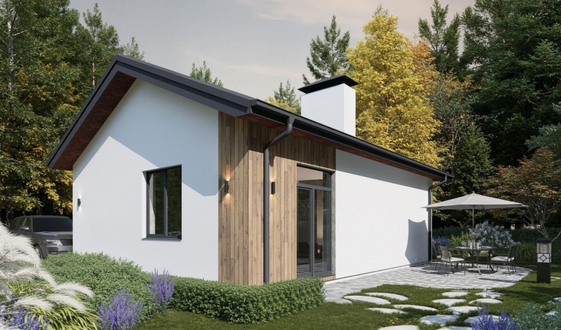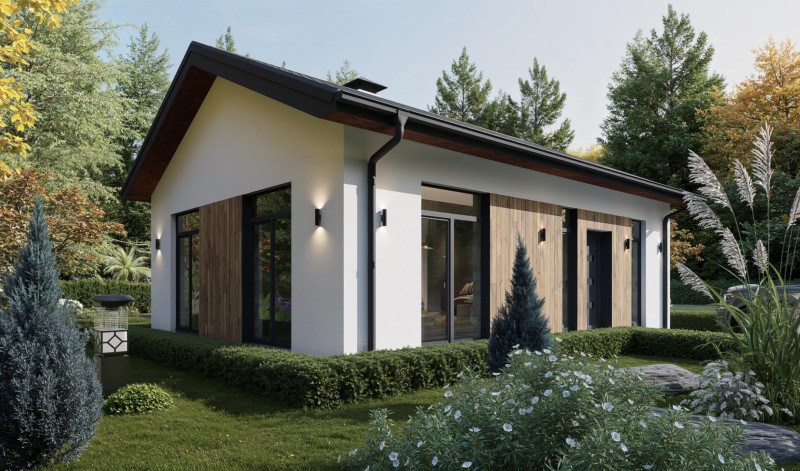 Лаконичный дом для небольшой семьи. Двускатная крыша, отделка фасадов декоративной штукатуркой, дополнительная декоративность деревянных вставок придают дому эстетичный вид. Панорамные окна комнат обеспечивают естественное освещение и особую атмосферу в доме. Несмотря на компактные размеры планировка дома предусматривает просторную кухню-гостиную с выходом во внутренний двор, две спальни и санузел. Этот проект может быть использован как небольшой дом для круглогодичного проживания и как загородный дом выходного дня.