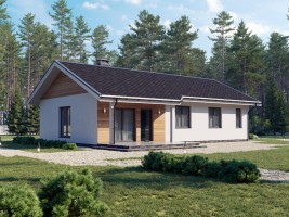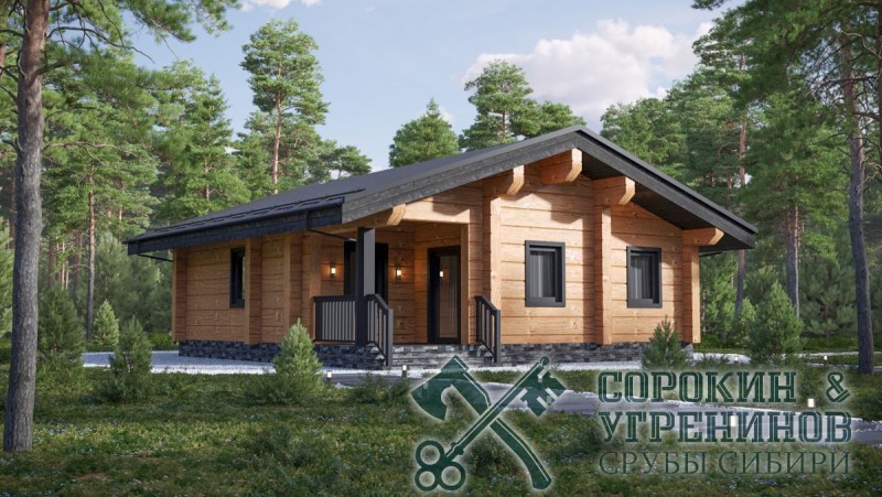 Проект загородного дома с баней внутри, рубленый из лафета сечением 250х400мм. Общая площадь дома 75м2. Одноэтажный дом имеет одну спальную комнату, есть просторная гостиная с кухней, парную с печью на дровах, душевая, и санузел, прихожая с гардеробом, и крыльцо.